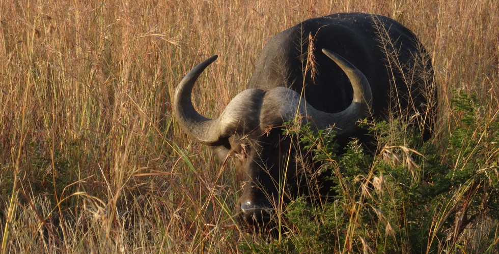 Nous partons alors en direction des lions, quelques minutes plus tard nous découvrons stupéfaits des lions en train de se balader autour du lodge comme s'ils faisaient une visite de courtoisie. Ils ne sont pas du tout agités et prennent leur temps, idéal pour nous afin de prendre de beaux clichés. Un peu plus loin, un éléphant est en train de se baigner, un autre a finit sa baignade et traverse la route juste devant notre jeep. Dans la savane, un buffle essaie de se cacher pour qu'on ne le repère pas, trop tard nous nous invitons à la réunion de famille. Quant aux girafes, elles sont en plein repas, elles mangent toujours plus haut. Le point positif, personne ne viendra les embêter lors du repas.